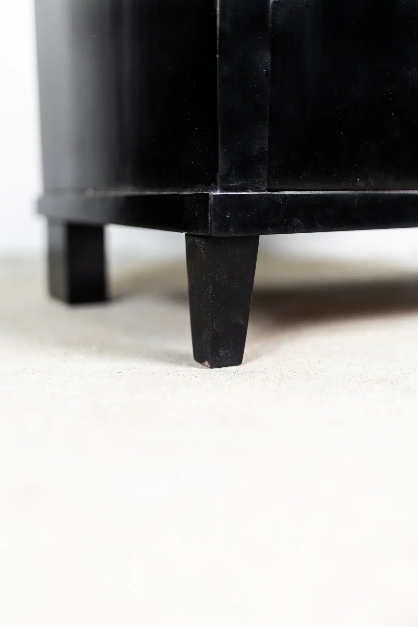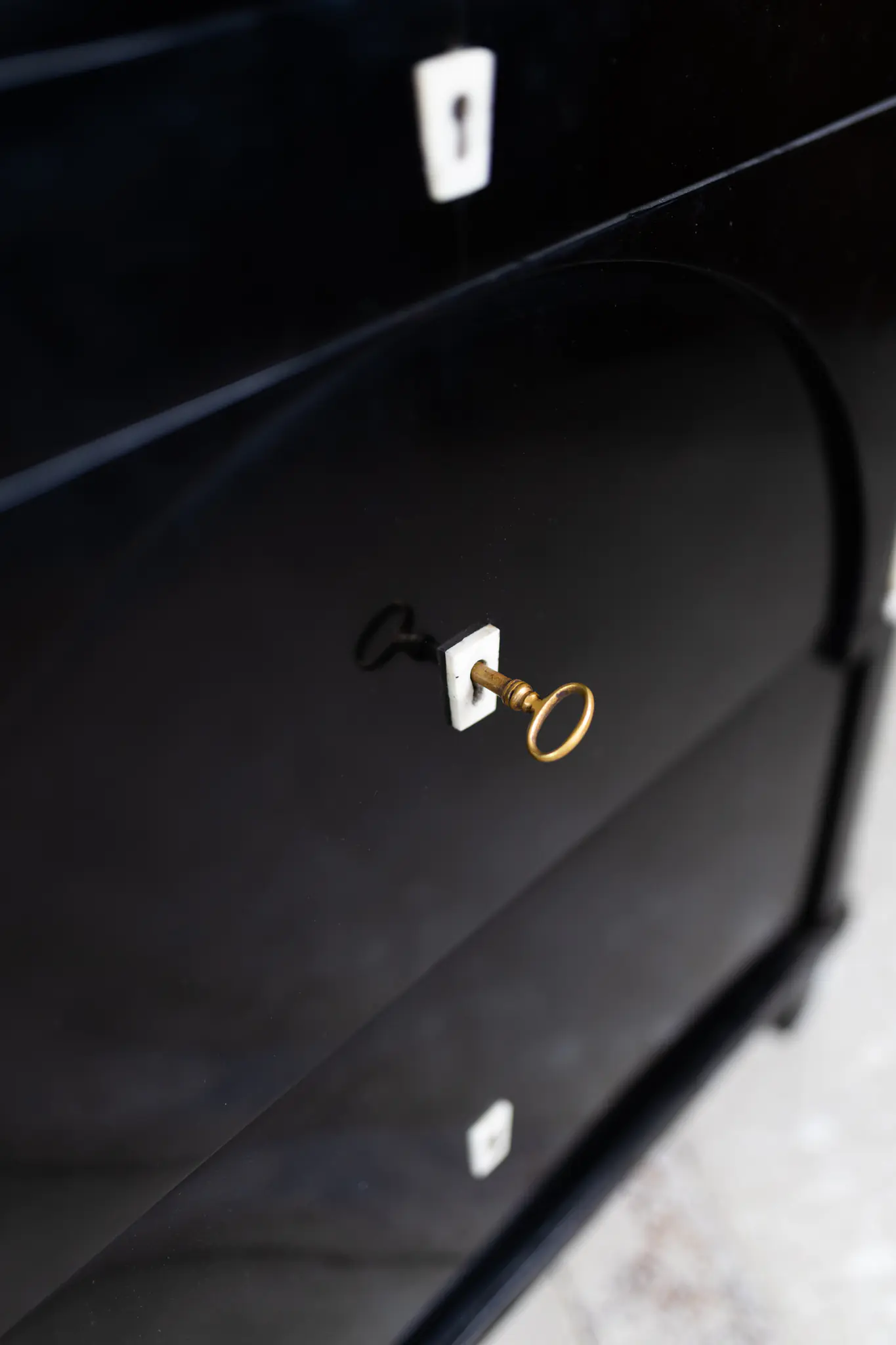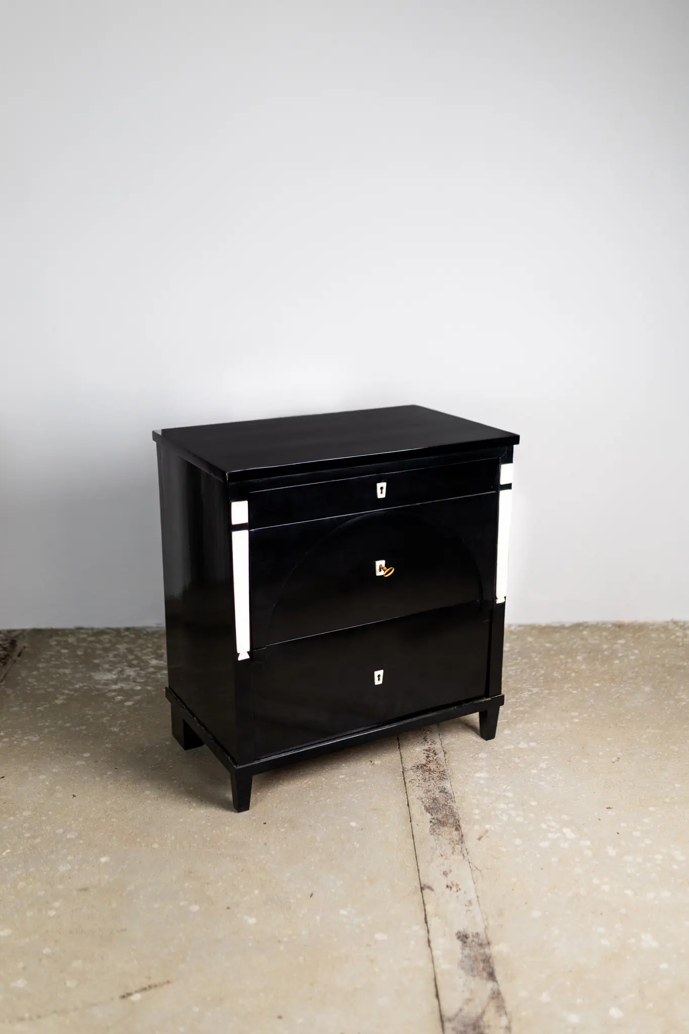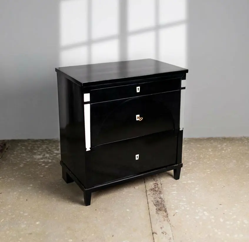 Komoda ma bardzo elegancką formę o subtelnych proporcjach, a marmurowe dekoracje podkreślają klasycystyczny charakter mebla. Ze względu na swoja prosta formę i czarno-białą kolorystykę wpisuje się w stylistykę art deco.
