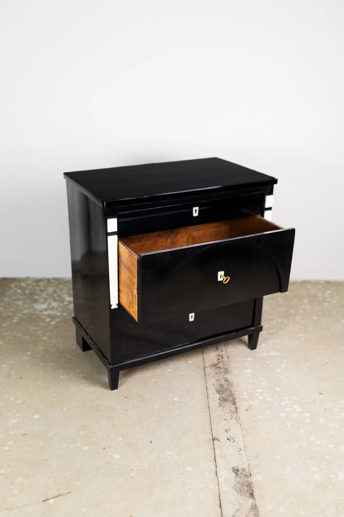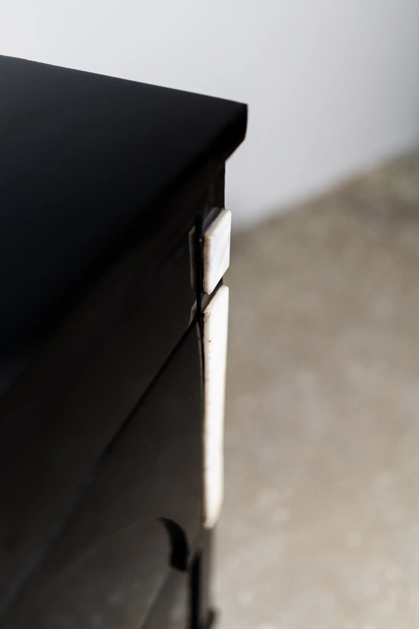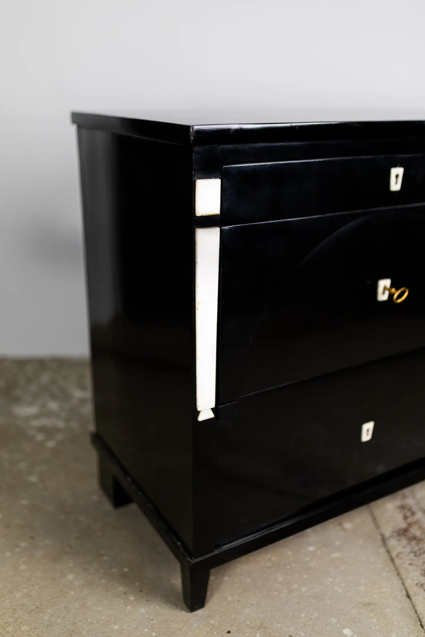Komoda ma bardzo elegancką formę o subtelnych proporcjach, a marmurowe dekoracje podkreślają klasycystyczny charakter mebla. Ze względu na swoja prosta formę i czarno-białą kolorystykę wpisuje się w stylistykę art deco.