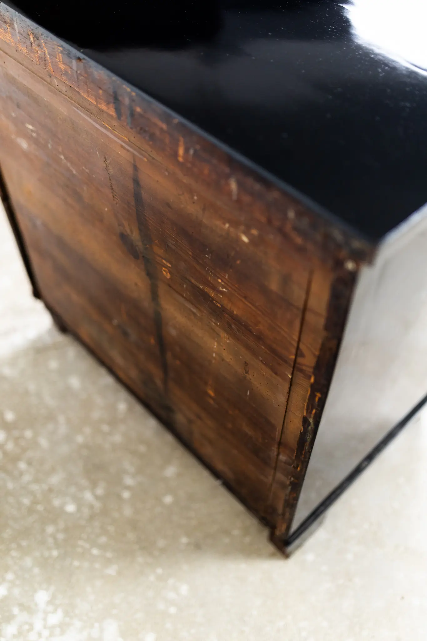 Na powierzchni widoczne są delikatne spękania charakterystyczne dla mebli wykonanych z drewna. Wszystkie zamki są sprawne z mosiężnym kluczem.