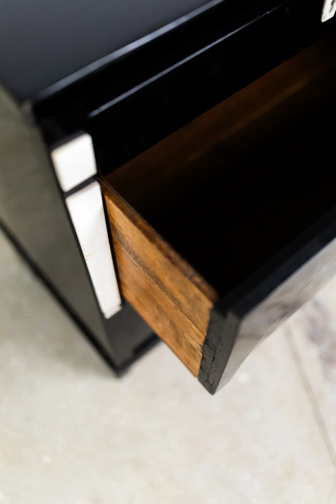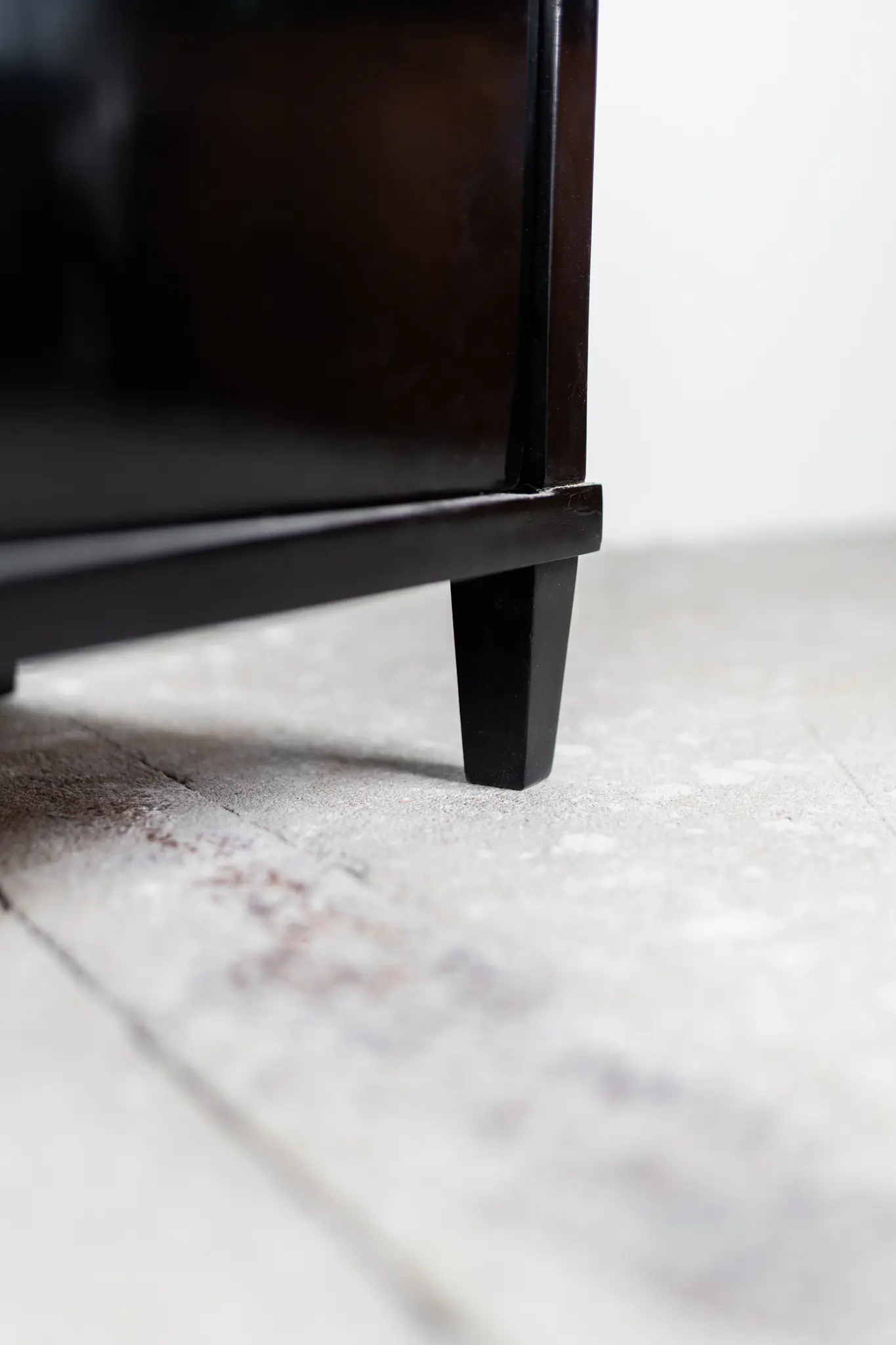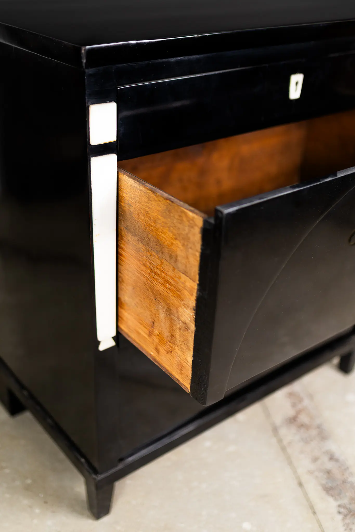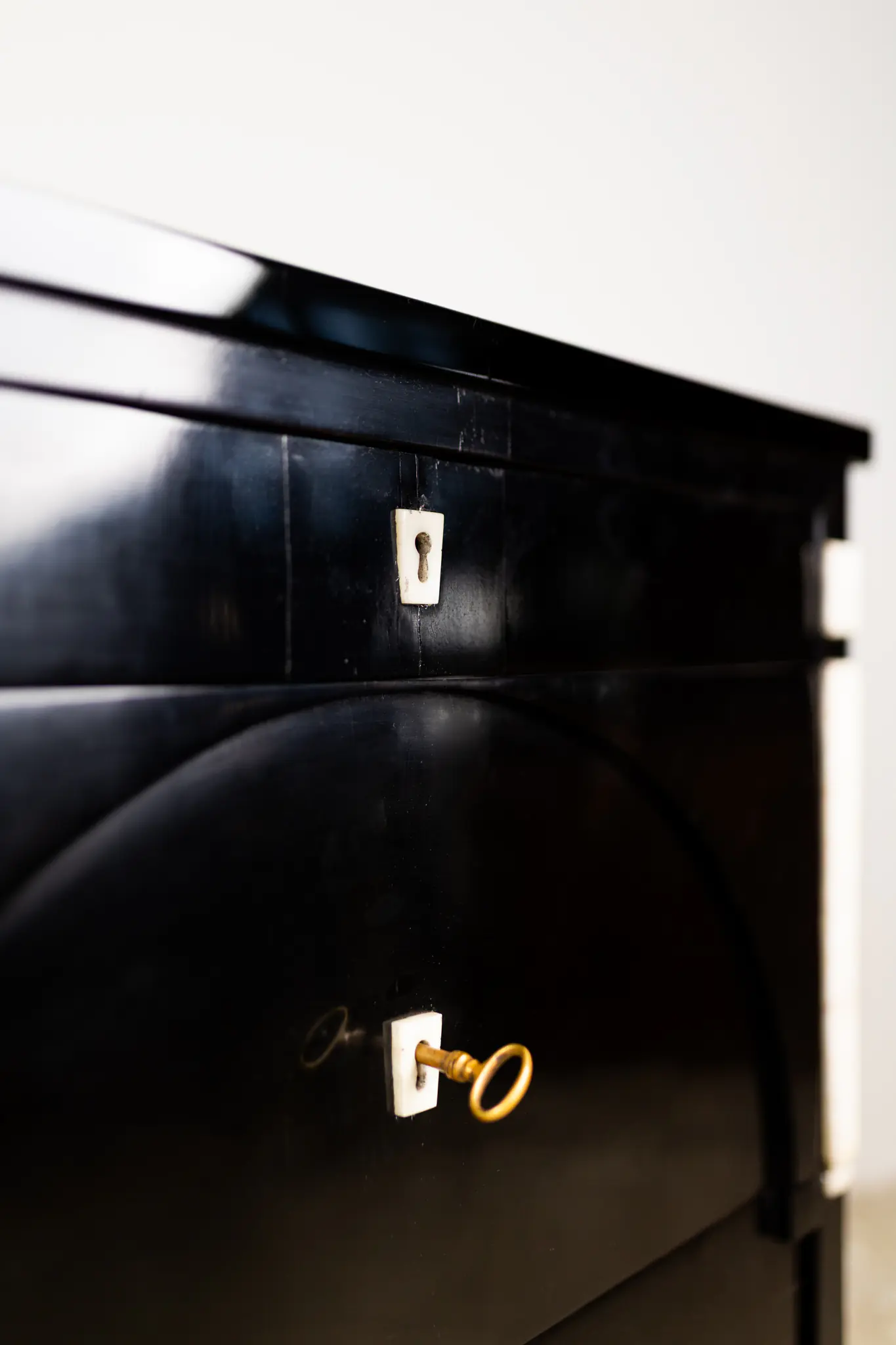 Wykończenie powierzchni jest w czarnej, fortepianowej politurze z dekoracyjnymi, wykonanymi z marmuru, detalami po bokach i przy kluczynach. Konstrukcja mebla wykonana jest z drewna sosnowego, fornirowana mahoniem. Wnętrza szuflad, zachowane w oryginalnym stanie, wykonane są z drewna dębowego z pięknie zachowaną patyną i eleganckimi frezowaniami na rantach. Przednie nóżki mebla, charakterystyczne dla stylu, zwężają się ku dołowi, tylne są w formie prostych klocków.