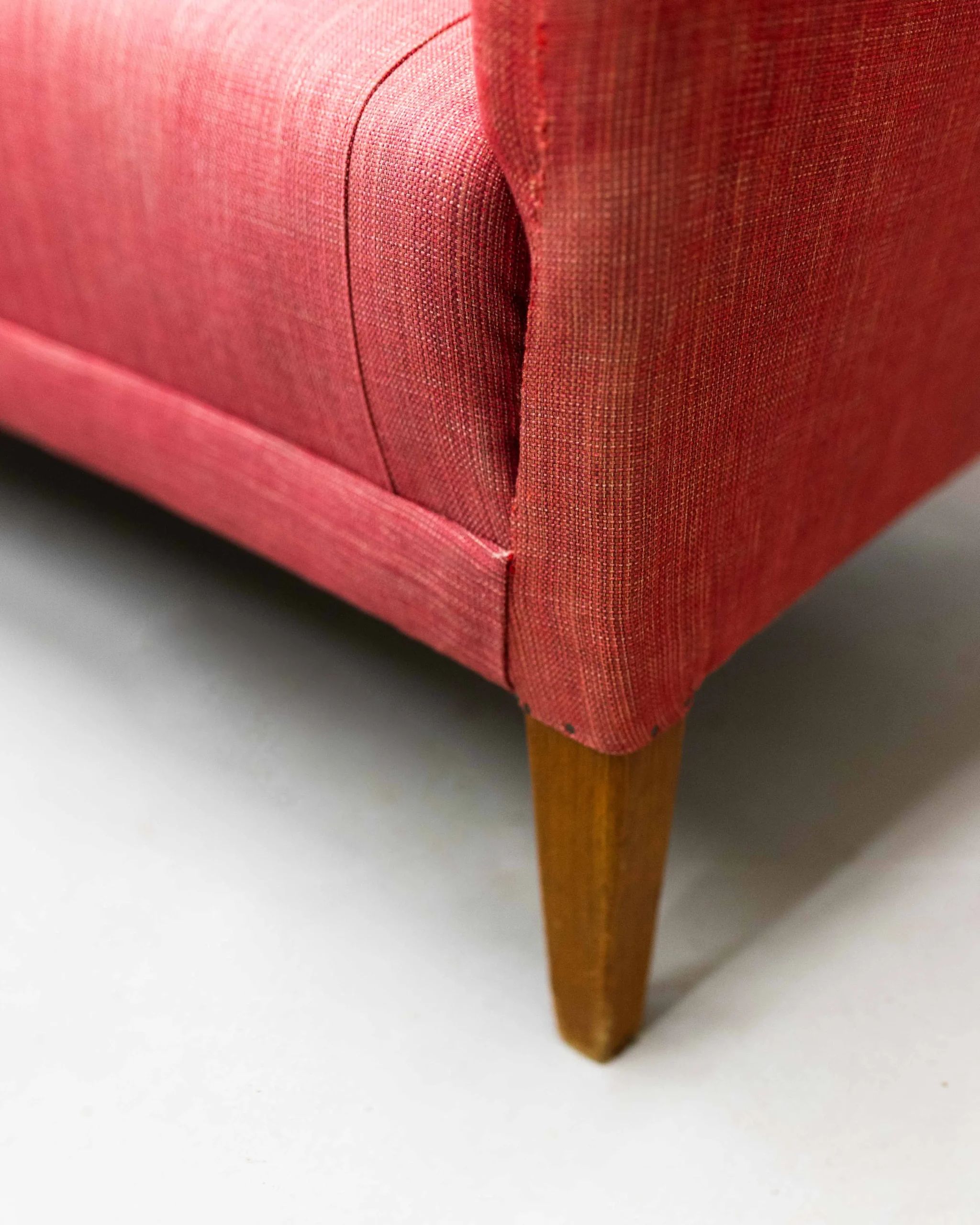 Stan mebla jest dobry, zachowana jest koralowa lniana tkanina, na życzenie klienta możemy wymienić tkaninę obiciową