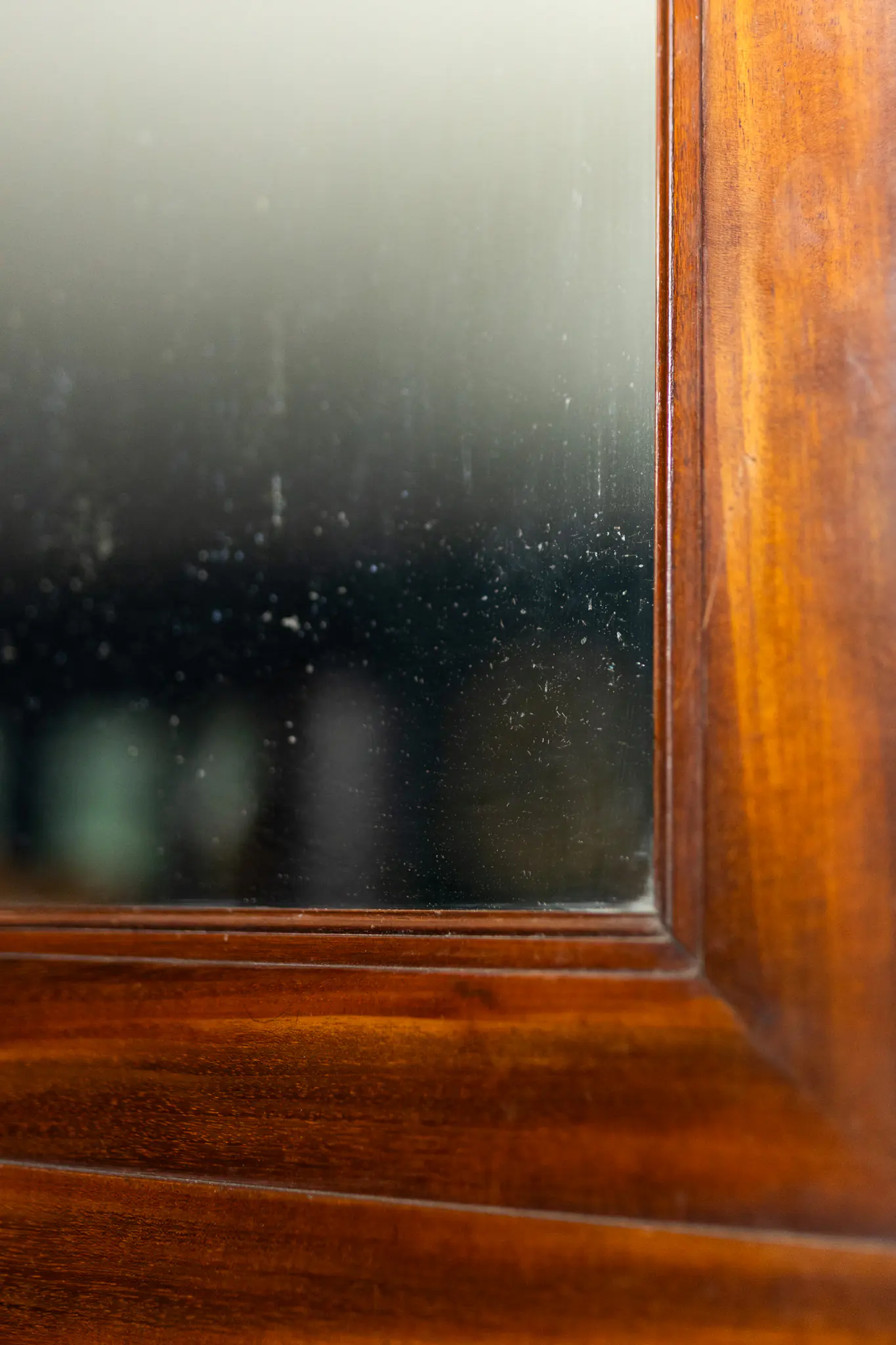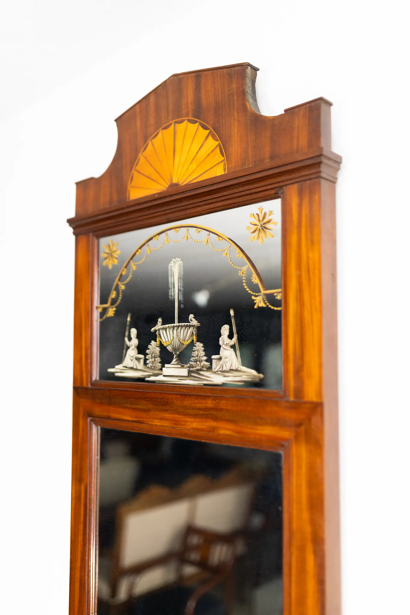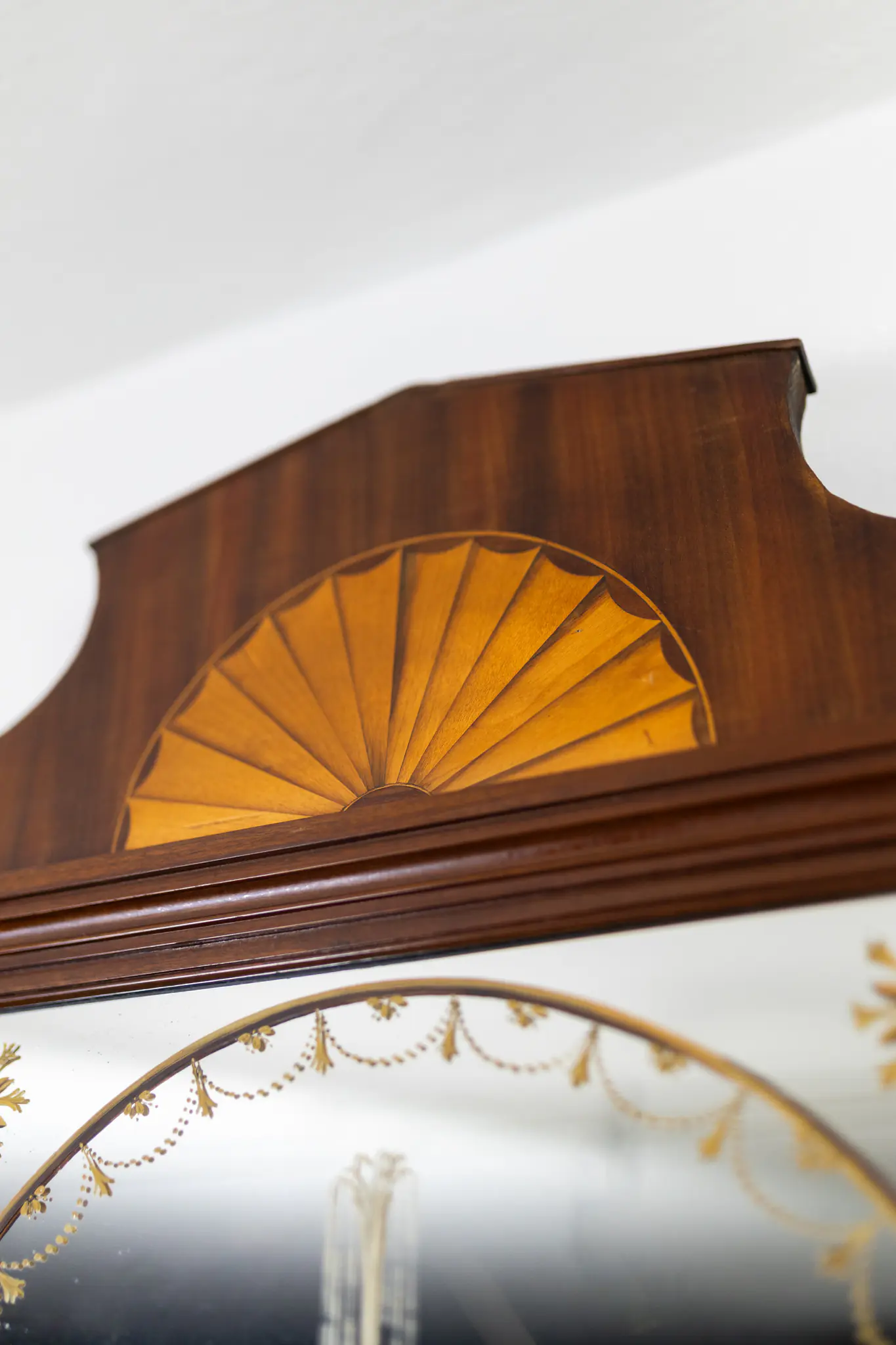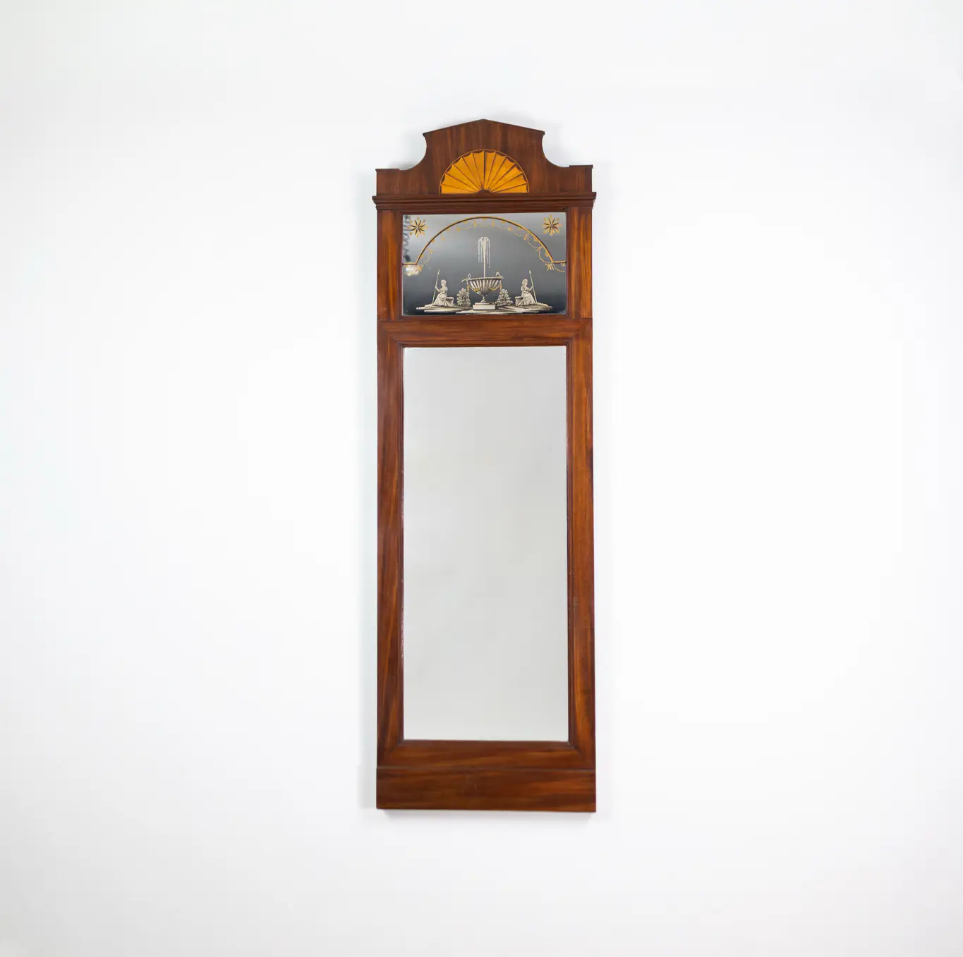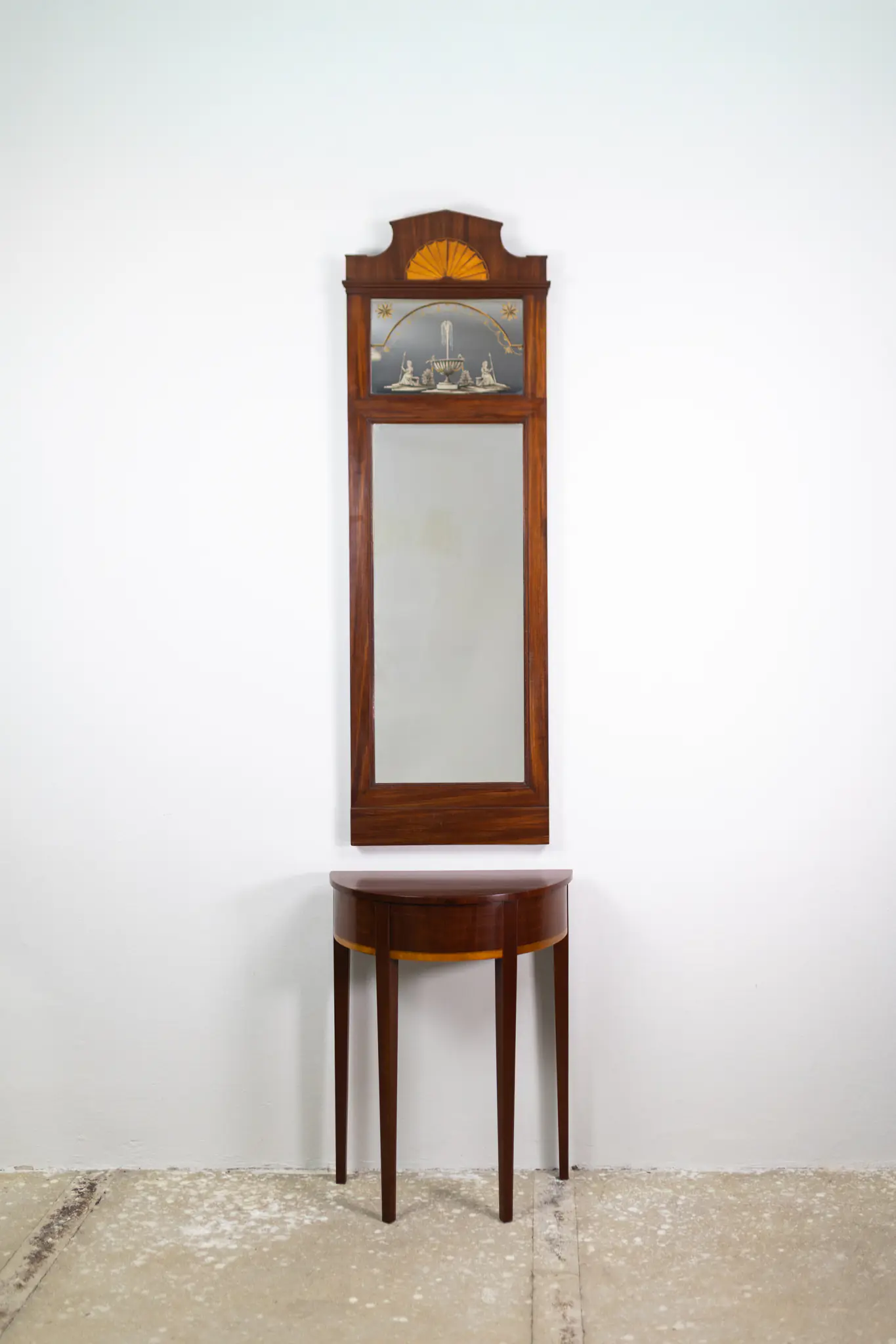 Duńskie lustro w stylu Empire. Konstrukcja mebla jest sosnowa, fornirowana mahoniem w politurze szelakowej matowanej woskiem pszczelim. Zwieńczenie dekorowane jest intarsją.