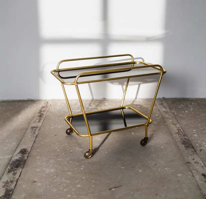 Wózek barowy Vintage – szkło lakierowane od spodu z drobnymi zarysowaniami. Wózek jest bardzo lekki, blaty półek są wyjmowalne, co w razie potrzeby daje możliwość łatwej wymiany szkła. Mebel zachowany w oryginalnym stanie